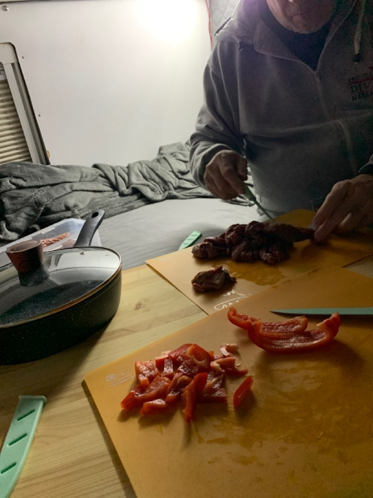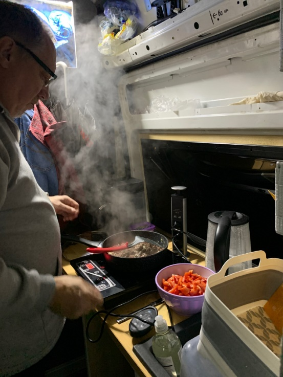 Heute wird im WoMo gekocht. Wetter hat sich leider wieder verschlechtert. Vor gut 1,5 Std. Eisregen und Sturm. Es gibt Geschnetzeltes vom Rind mit roten Paprika und Knoblauch.