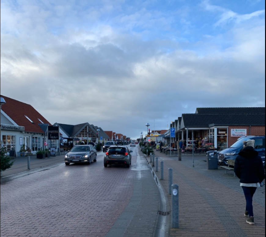 Shoppingstrasse von Blavand. Niedliche Straßenlaternen und Kerzenzieherei besucht. Blavand Bolchenmanufaktur darf nicht fehlen.