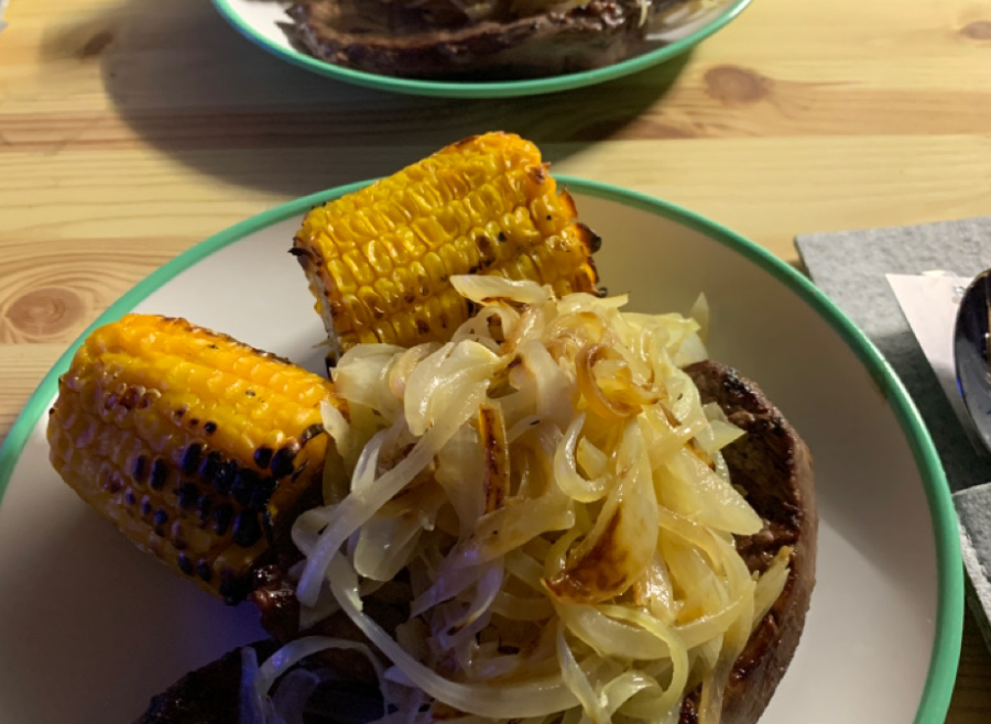 Argentinisches Rindersteak vom Grill und gedünstete Zwiebeln. Warum das Womo vollstänkern. 👍🤩 Dafür ein riesiges Lob an die Betreiber / Inhaber vom Stjerne Camping. Die Küche, der Aufenthaltsraum und alles drum herum ist wirklich auf diesem Platz gelungen.